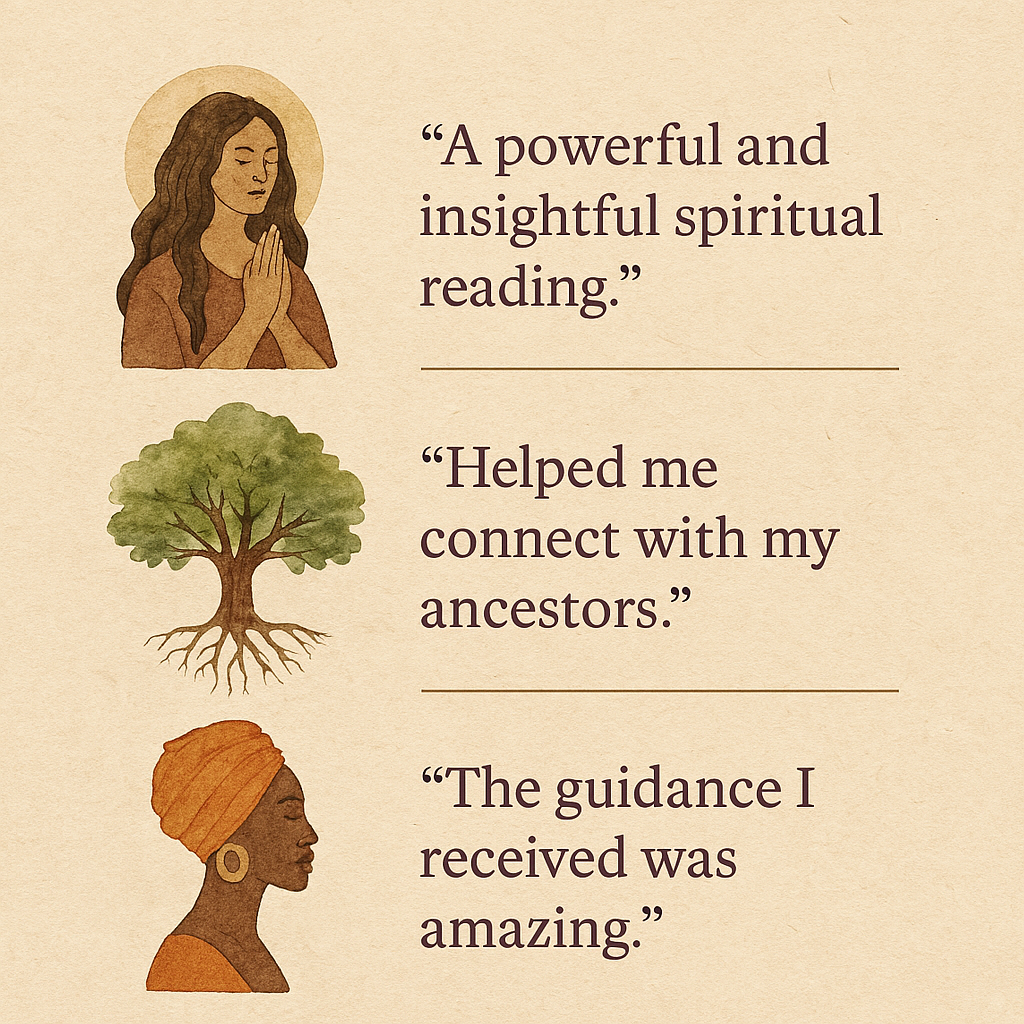 “I just wanted to give you an update and my testimony. So, my daughter is still in treatment but in outpatient and she is doing much better so yes as my ancestors kept telling me in my last reading that she would be ok. And that she is. So, thank you so much for all that you are. My second update is that I completed the heart chakra work that they told me to do and I made preparations for my divine partner that they told me would come. Well he is here, he showed up a couple of weeks ago, and all the things that they said about him are true. I am still trying to process this union. I am still in shock LOL. He is truly a mirror reflection of me, our lives are so parallel that it is mind blowing. I just had to share and give you those updates. My daughter keeps saying that I will be getting married soon LOL but I will be sending you a wedding invite in time. Thank you again for all that you do and that all you are! I am glad that my ancestors chose you to help me on this journey.” - LESHANDRA LOVE